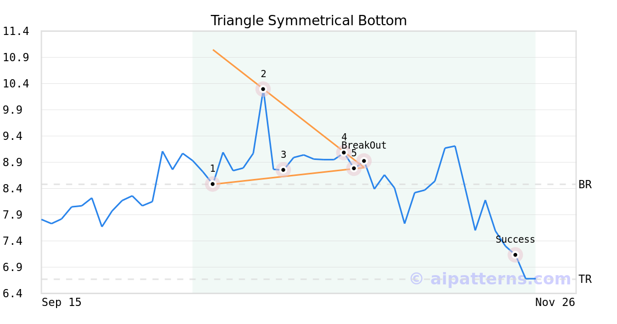 On October 28, 2025, A.I.dvisor detected a Triangle Symmetrical Bottom Pattern (Bearish) for Array Technologies (ARRY, $8.78). 1 day later, on October 29, 2025, A.I.dvisor confirmed the Bearish pattern, setting a target price of the stock. On November 19, 2025, the stock hit the target price of $6.67 – resulting in a +1 gain for traders who shorted the stock on the pattern detection date.