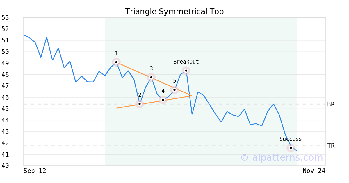 On October 20, 2025, A.I.dvisor detected a Triangle Symmetrical Top Pattern (Bearish) for ASGN (ASGN, $46.64). 2 days later, on October 22, 2025, A.I.dvisor confirmed the Bearish pattern, setting a target price of the stock. On November 17, 2025, the stock hit the target price of $41.75 – resulting in a +1 gain for traders who shorted the stock on the pattern detection date.