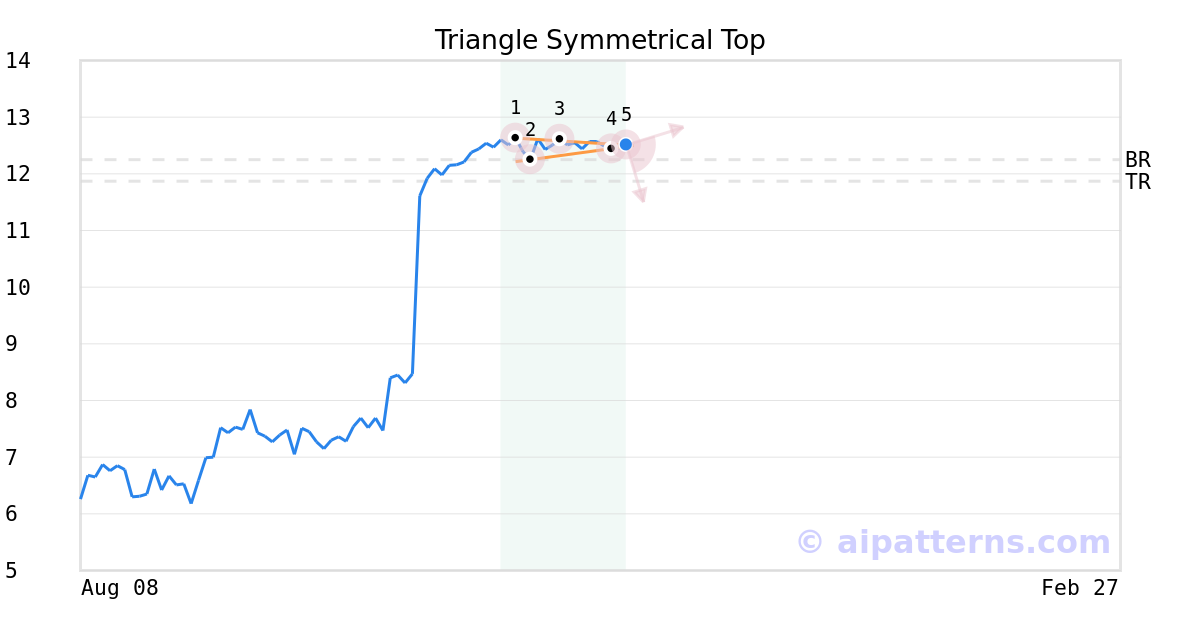 The Symmetrical Triangle Top pattern forms when the price of a security fails to retest a high or low and ultimately forms two narrowing trend lines.
