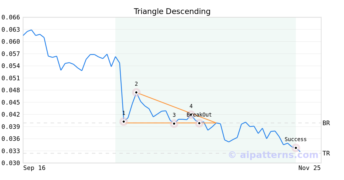 On October 28, 2025, A.I.dvisor detected a Triangle Descending Pattern (Bearish) for Audius cryptocurrency (AUDIO.X, $0.039772). On October 28, 2025, A.I.dvisor confirmed the Bearish pattern, setting a target price of the stock. On November 20, 2025, the stock hit the target price of $0.032400 – resulting in a +1 gain for traders who shorted the stock on the pattern detection date.