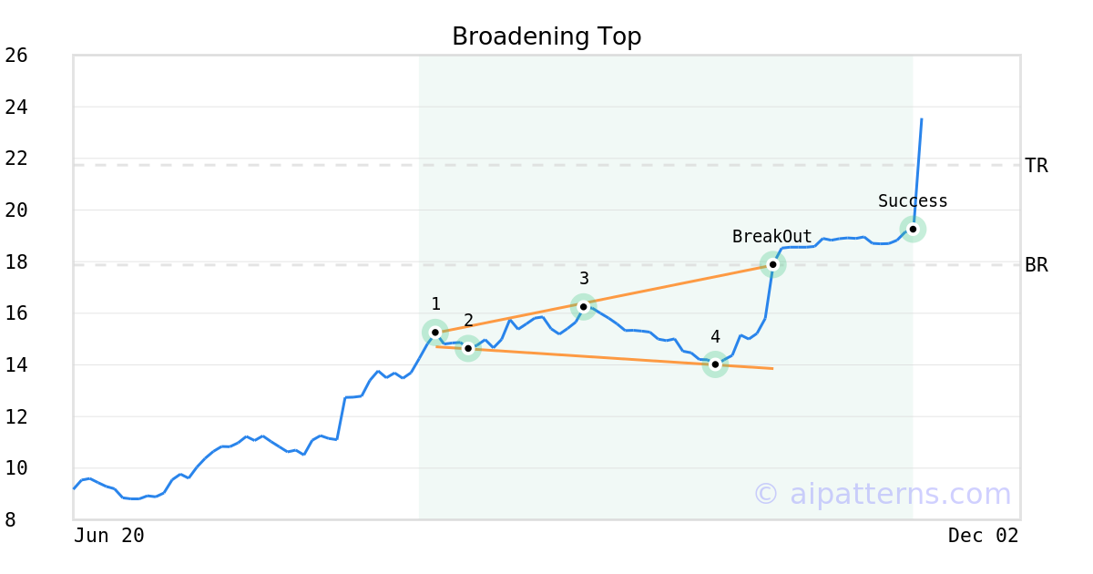 On October 21, 2025, A.I.dvisor detected a Broadening Top Pattern (Bullish) for Avadel Pharmaceuticals plc (AVDL, $17.87). On October 21, 2025, A.I.dvisor confirmed the Bullish pattern, setting a target price of $21.74. 23 days later, on November 13, 2025, AVDL reached the target price resulting in a for traders who took a long position in the stock.