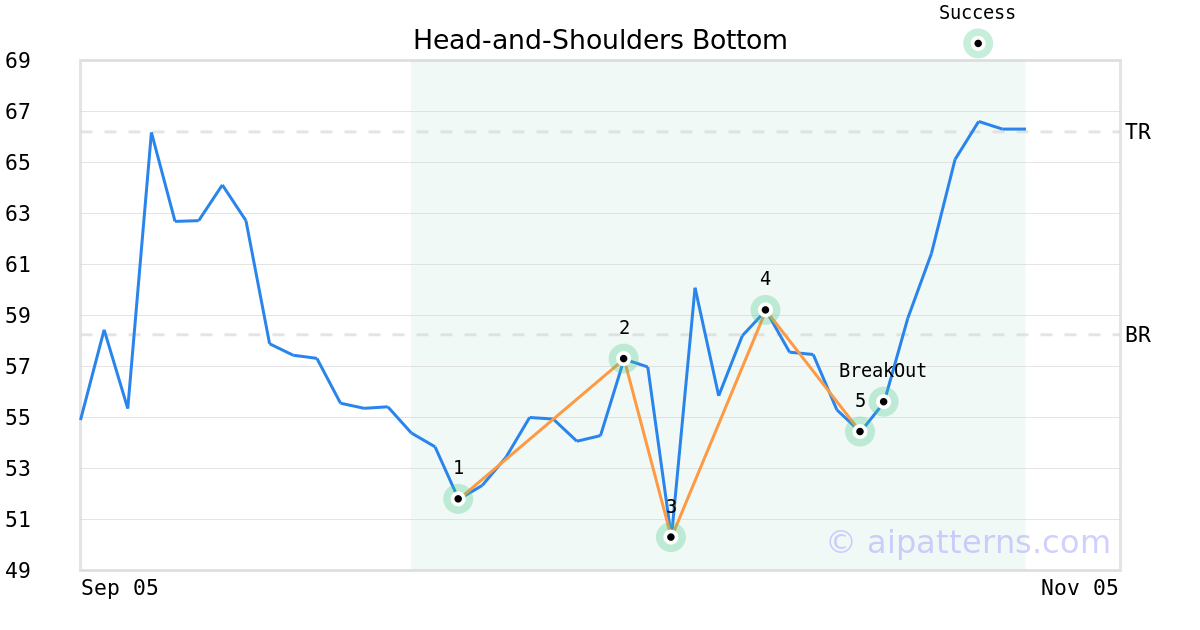 On October 22, 2025, A.I.dvisor detected a Head-and-Shoulders Bottom Pattern (Bullish) for Direxion Daily AVGO Bull 2X Shares (AVL, $54.43). On October 23, 2025, A.I.dvisor confirmed the Bullish pattern, setting a target price of $66.20. 6 days later, on October 29, 2025, AVL reached the target price resulting in a +2 for traders who took a long position in the stock.