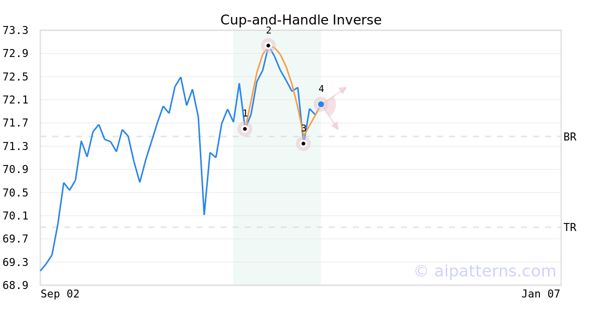 The Inverted Cup-and-Handle (sometimes called Inverted Cup-and-Holder) pattern forms when prices rise then decline to create an upside-down “U”like shape (1, 2, 3, also known as the Cup), followed by a shorter relatively straight price increase that bounces from the right lip (from 3 to 4, creating the Handle).