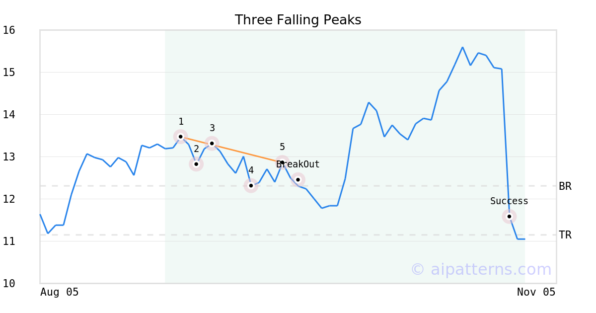 On September 18, 2025, A.I.dvisor detected a Three Falling Peaks Pattern (Bearish) for Avantor (AVTR, $12.86). 4 days later, on September 22, 2025, A.I.dvisor confirmed the Bearish pattern, setting a target price of the stock. On October 29, 2025, the stock hit the target price of $11.15 – resulting in a gain for traders who shorted the stock on the pattern detection date.