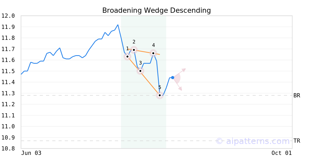 A.I.dvisor detected a bearish Broadening Wedge Descending pattern for AZNIX stock. This pattern was detected on August 05, 2024 . The odds of reaching the target price are 6. The Broadening Wedge Descending pattern forms when a security price makes lower lows (1, 3, 5) and lower highs (2, 4), forming two downward sloping lines that expand over time. Consider selling the security short or buying a put option at the downward breakout price level, which is the last low touching the bottom line.