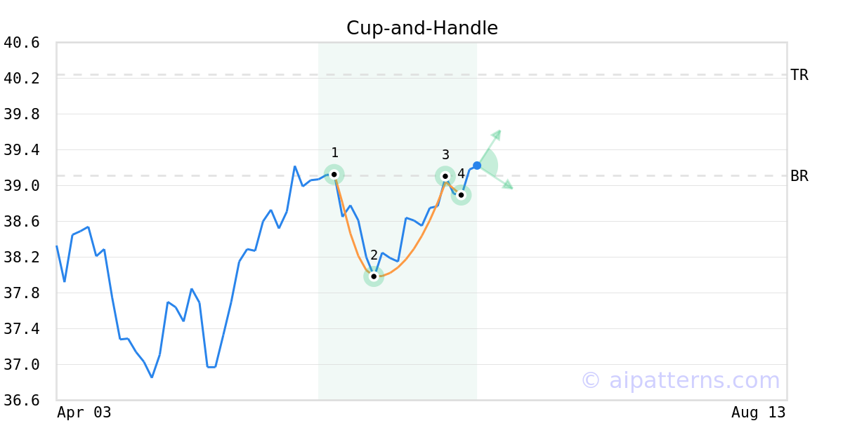A.I.dvisor detected a bullish Cup-and-Handle pattern for BAFAX stock. This pattern was detected on June 14, 2024 . The odds of reaching the target price are 6. The Cup-and-Handle (sometimes called Cup-and-Holder) pattern is formed when the price of a security initially declines and then rises to form a “U”-like rounded shape (1, 2, 3, also known as the Cup). Once it forms the right lip, it is characterized by short, relatively straight price decline (from 3 to 4) forming the handle. Consider buying a security or call option at the upward breakout price/entry point. The confirmation move is when the security moves past the breakout price above the right cup lip.