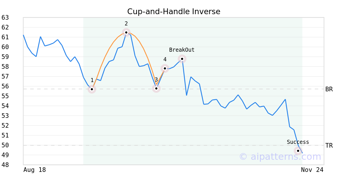 On October 03, 2025, A.I.dvisor detected a Cup-and-Handle Inverse Pattern (Bearish) for Brookfield Asset Management Ltd (BAM, $56.79). 6 days later, on October 09, 2025, A.I.dvisor confirmed the Bearish pattern, setting a target price of the stock. On November 17, 2025, the stock hit the target price of $49.98 – resulting in a +1 gain for traders who shorted the stock on the pattern detection date.