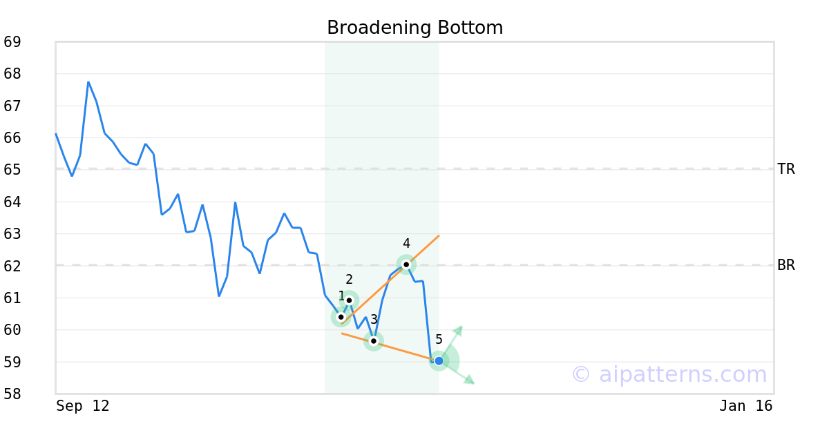 The Broadening Bottom pattern is formed when the price of a security progressively makes higher highs (2, 4) and lower lows (1, 3, 5) following two widening trend lines.