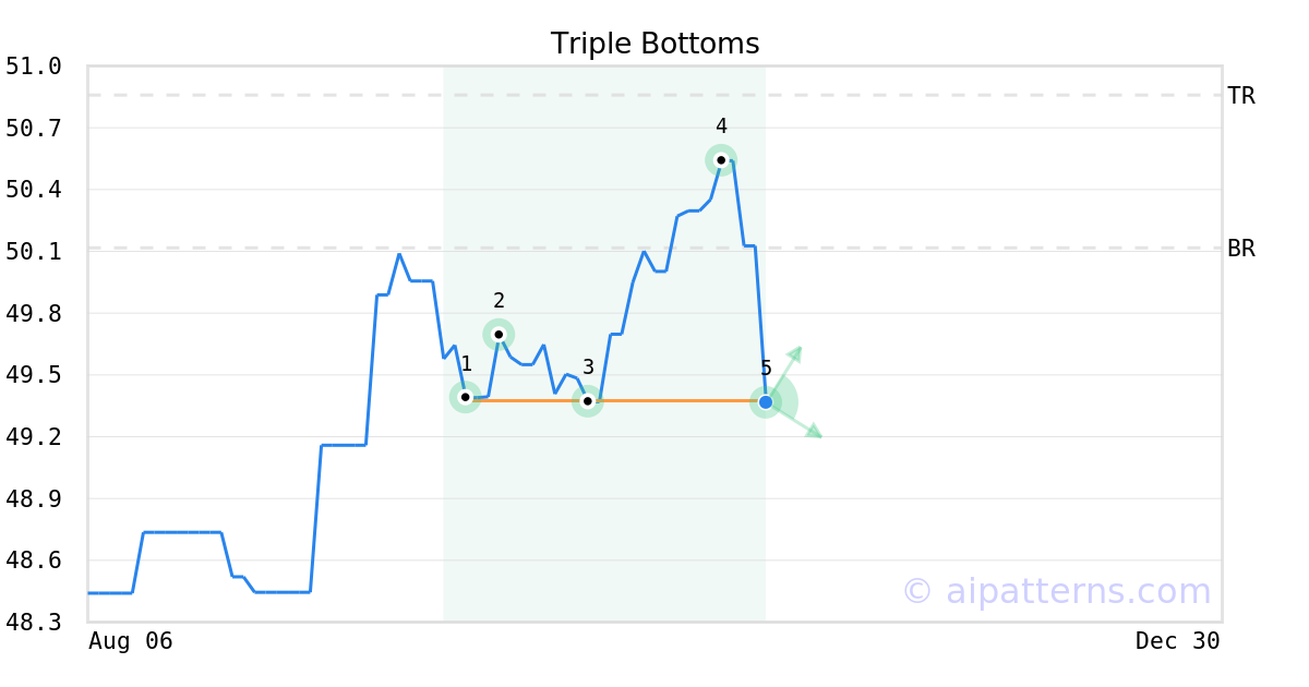 The Triple Bottom pattern appears when there are three distinct low points (1, 3, 5) that represent a consistent support level.