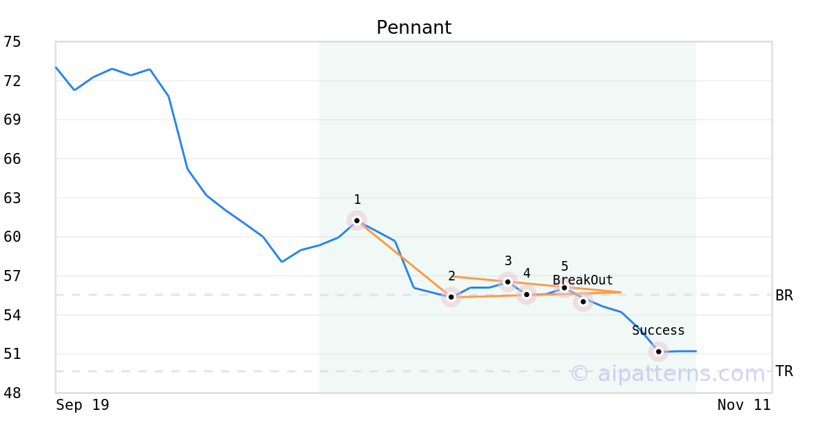 On October 28, 2025, A.I.dvisor detected a Pennant Pattern (Bearish) for Build-A-Bear Workshop (BBW, $56.06). 1 day later, on October 29, 2025, A.I.dvisor confirmed the Bearish pattern, setting a target price of the stock. On November 04, 2025, the stock hit the target price of $49.67 – resulting in a gain for traders who shorted the stock on the pattern detection date.