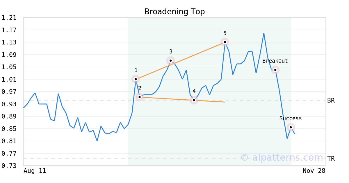 On October 23, 2025, A.I.dvisor detected a Broadening Top Pattern (Bearish) for Biofrontera (BFRI, $1.13). 19 days later, on November 11, 2025, A.I.dvisor confirmed the Bearish pattern, setting a target price of the stock. On November 17, 2025, the stock hit the target price of $0.75 – resulting in a +2 gain for traders who shorted the stock on the pattern detection date.
