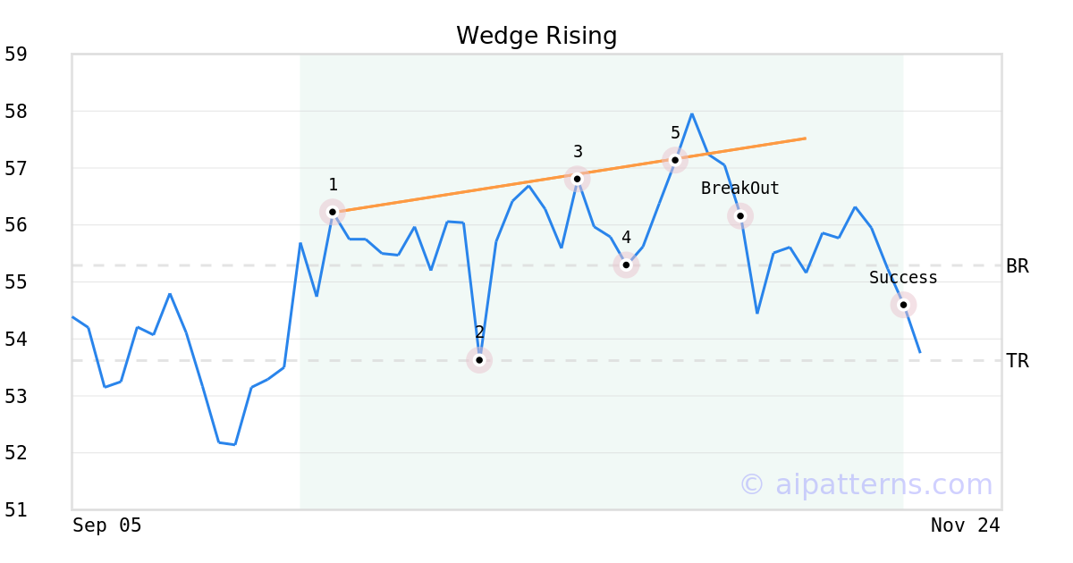 On October 28, 2025, A.I.dvisor detected a Wedge Rising Pattern (Bearish) for BHP Group Limited (BHP, $57.13). 6 days later, on November 03, 2025, A.I.dvisor confirmed the Bearish pattern, setting a target price of the stock. On November 17, 2025, the stock hit the target price of $53.62 – resulting in a gain for traders who shorted the stock on the pattern detection date.