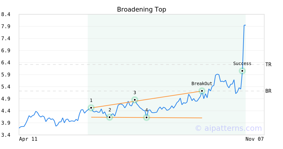 On September 18, 2025, A.I.dvisor detected a Broadening Top Pattern (Bullish) for BioAge Labs Inc. (BIOA, $5.22). On September 18, 2025, A.I.dvisor confirmed the Bullish pattern, setting a target price of $6.32. 34 days later, on October 22, 2025, BIOA reached the target price resulting in a +1 for traders who took a long position in the stock.