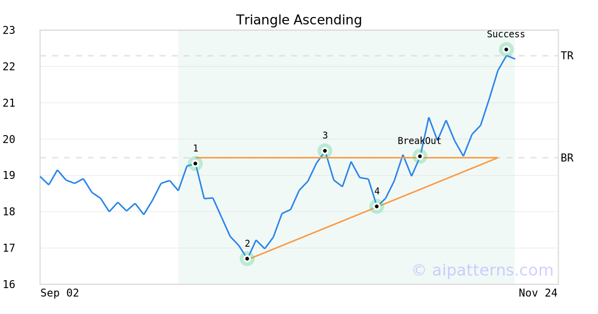 On November 03, 2025, A.I.dvisor detected a Triangle Ascending Pattern (Bullish) for ProShares Shrt Bitcoin ETF (BITI, $19.52). On November 03, 2025, A.I.dvisor confirmed the Bullish pattern, setting a target price of $22.30. 14 days later, on November 17, 2025, BITI reached the target price resulting in a +1 for traders who took a long position in the stock.