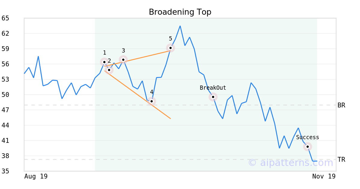 On October 02, 2025, A.I.dvisor detected a Broadening Top Pattern (Bearish) for ProShares Ultra Bitcoin ETF (BITU, $58.63). 13 days later, on October 15, 2025, A.I.dvisor confirmed the Bearish pattern, setting a target price of the stock. On November 12, 2025, the stock hit the target price of $37.30 – resulting in a +3 gain for traders who shorted the stock on the pattern detection date.