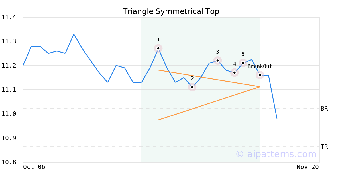 On November 11, 2025, A.I.dvisor detected a Triangle Symmetrical Top Pattern (Bearish) for BlackRock Income Trust (BKT, $11.12). 2 days later, on November 13, 2025, A.I.dvisor confirmed the Bearish pattern, setting a target price of the stock. On November 13, 2025, the stock hit the target price of $10.86 – resulting in a gain for traders who shorted the stock on the pattern detection date.