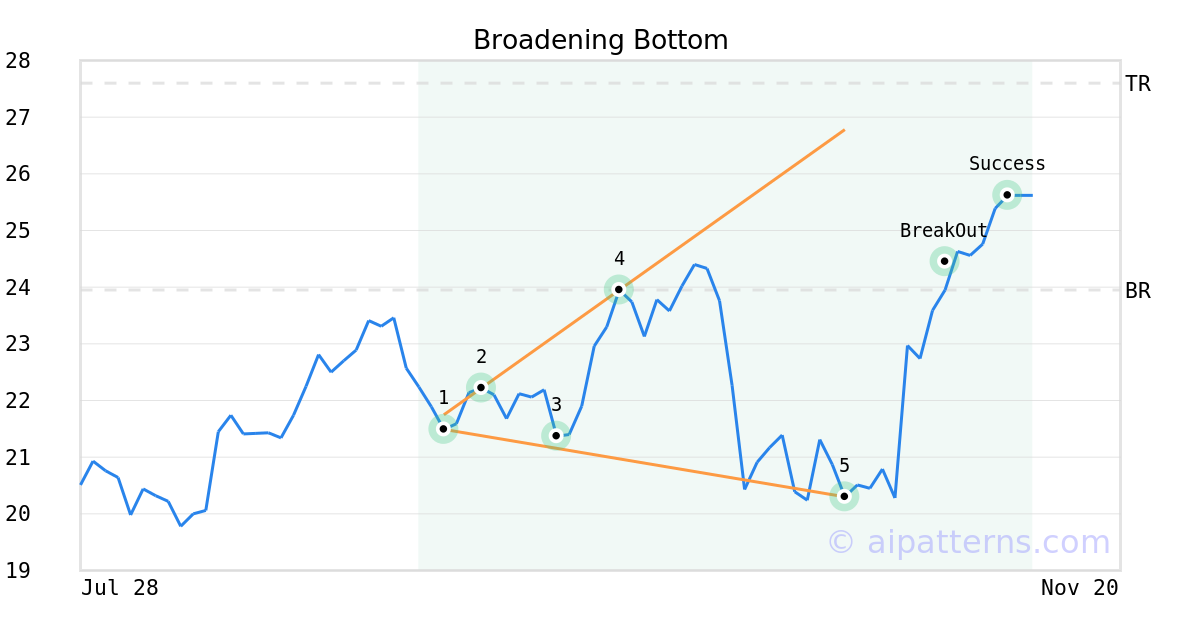On October 22, 2025, A.I.dvisor detected a Broadening Bottom Pattern (Bullish) for BKV Corp (BKV, $20.30). On November 03, 2025, A.I.dvisor confirmed the Bullish pattern, setting a target price of $27.60. 7 days later, on November 10, 2025, BKV reached the target price resulting in a +2 for traders who took a long position in the stock.