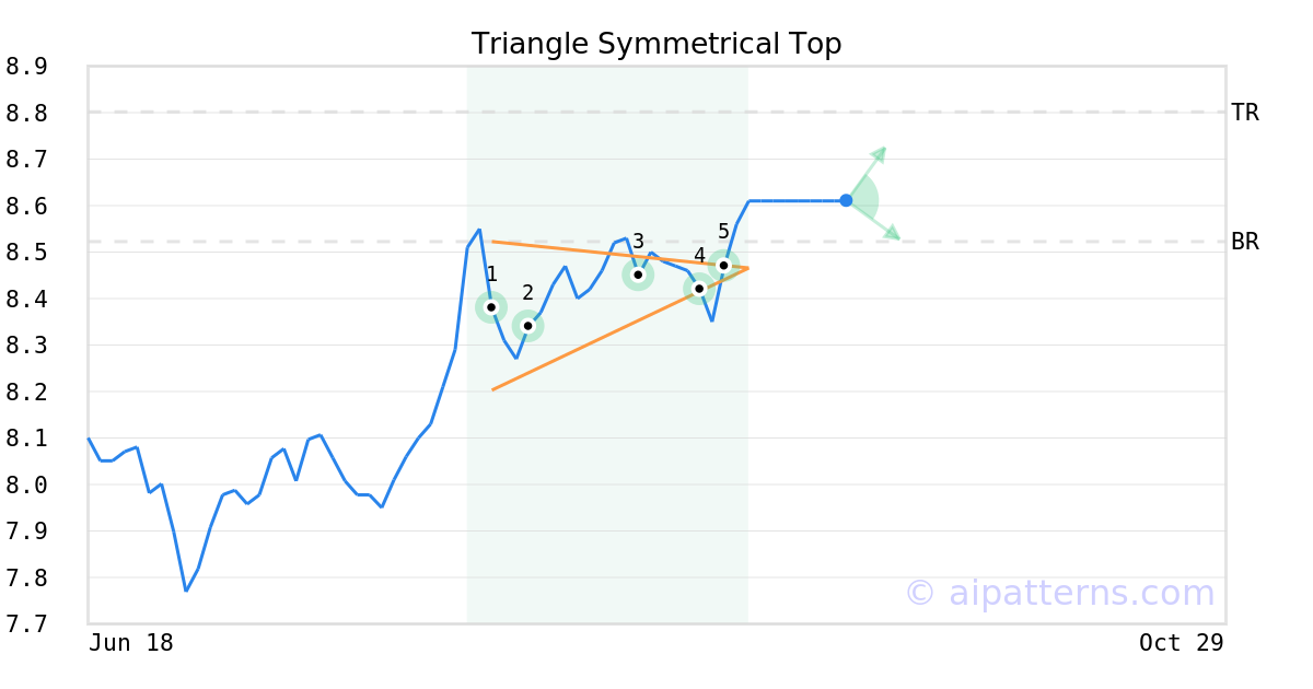 The Symmetrical Triangle Top pattern forms when the price of a security fails to retest a high or low and ultimately forms two narrowing trend lines.