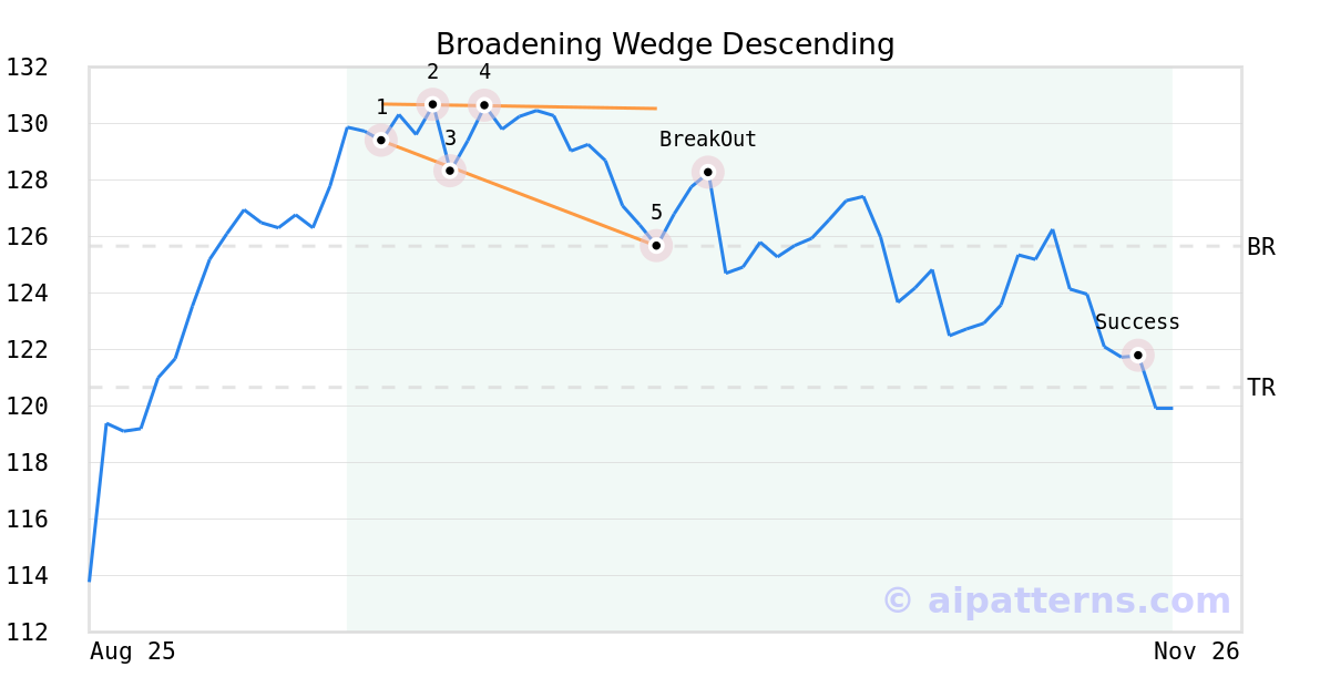 On October 10, 2025, A.I.dvisor detected a Broadening Wedge Descending Pattern (Bearish) for Bank of Montreal (BMO, $125.66). 5 days later, on October 15, 2025, A.I.dvisor confirmed the Bearish pattern, setting a target price of the stock. On November 19, 2025, the stock hit the target price of $120.66 – resulting in a gain for traders who shorted the stock on the pattern detection date.