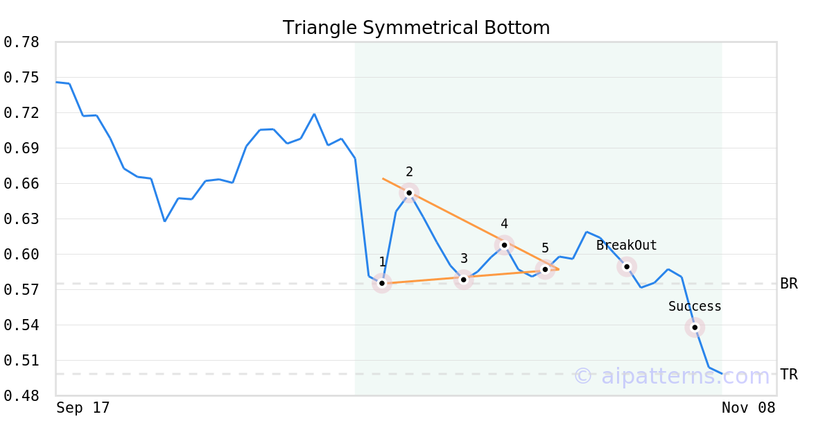 On October 23, 2025, A.I.dvisor detected a Triangle Symmetrical Bottom Pattern (Bearish) for Bancor cryptocurrency (BNT.X, $0.587487). 6 days later, on October 29, 2025, A.I.dvisor confirmed the Bearish pattern, setting a target price of the stock. On November 03, 2025, the stock hit the target price of $0.498500 – resulting in a gain for traders who shorted the stock on the pattern detection date.