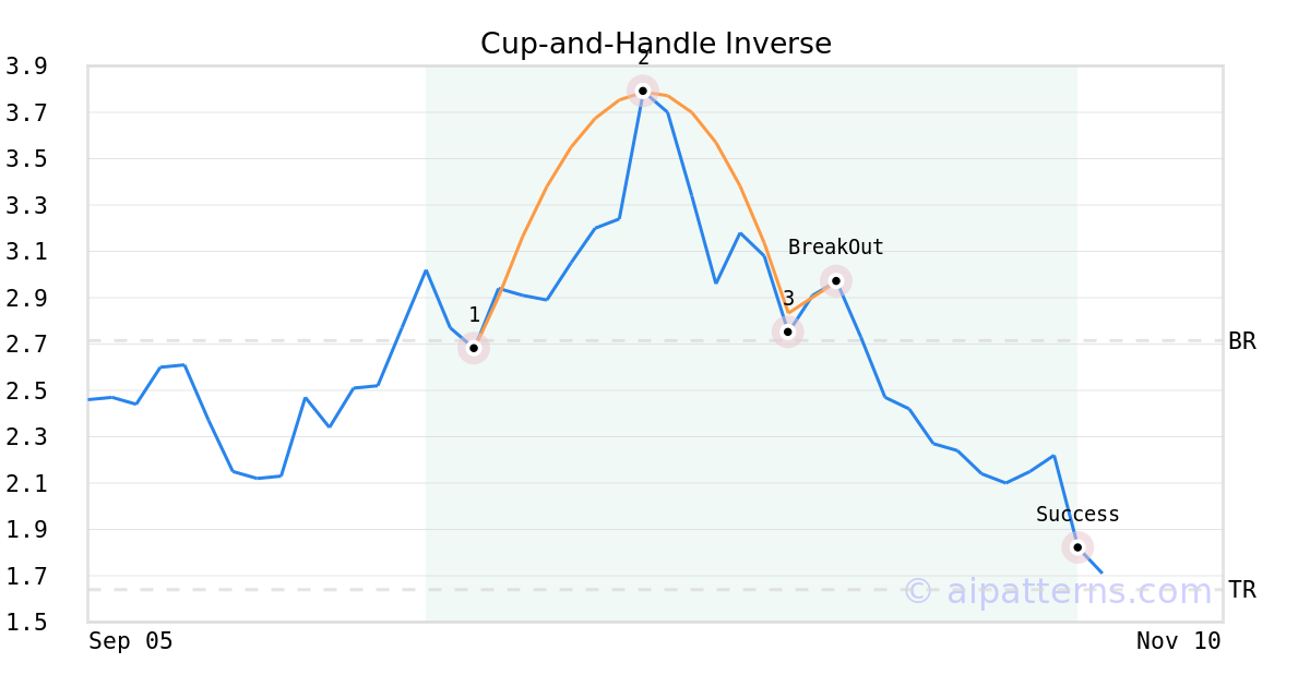 On October 20, 2025, A.I.dvisor detected a Cup-and-Handle Inverse Pattern (Bearish) for Banzai International Inc (BNZI, $2.97). On October 20, 2025, A.I.dvisor confirmed the Bearish pattern, setting a target price of the stock. On November 03, 2025, the stock hit the target price of $1.64 – resulting in a +3 gain for traders who shorted the stock on the pattern detection date.
