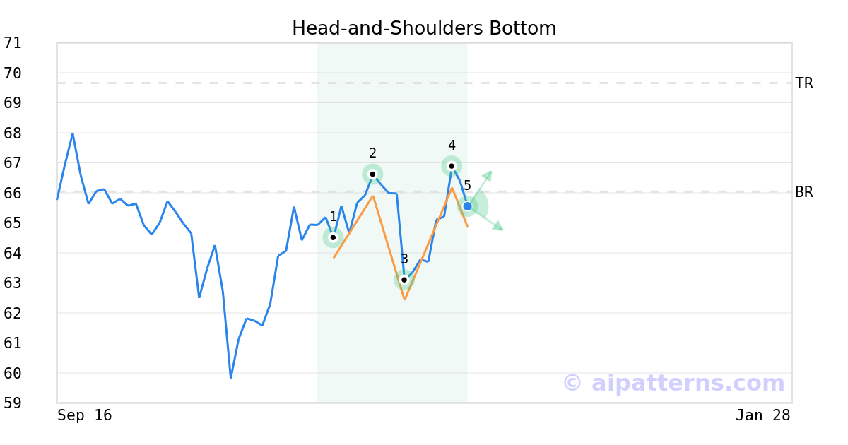 The Head-and-Shoulders Bottom pattern is formed when the price of a security creates a center trough (the inverted head, labeled 3) and the left and right inverted shoulders (1, 5). After reaching the lowest low (the Head, 3) the next low is shallower and the trend reverses course to the upside.