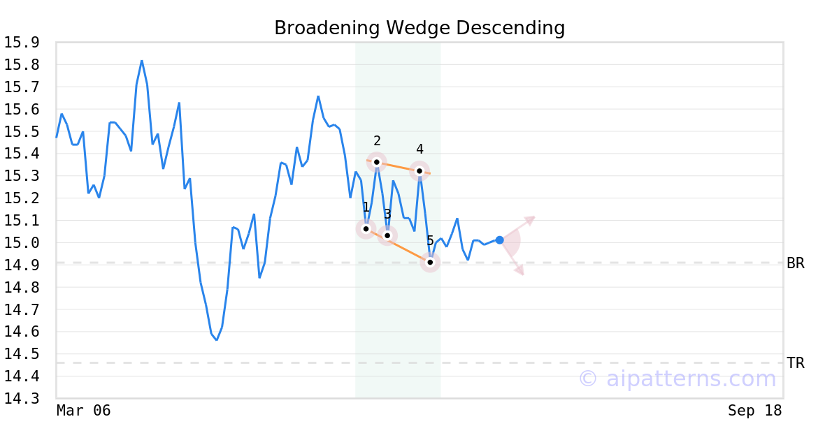 The Broadening Wedge Descending pattern forms when a security price makes lower lows (1, 3, 5) and lower highs (2, 4), forming two downward sloping lines that expand over time.