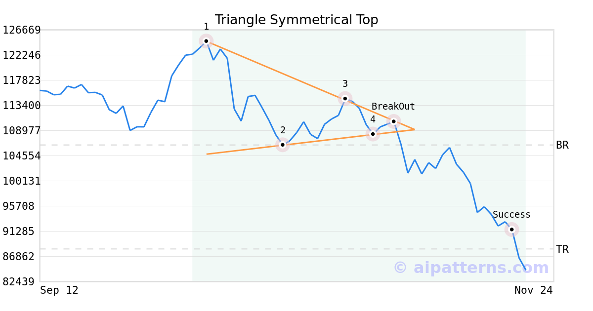 On November 02, 2025, A.I.dvisor detected a Triangle Symmetrical Top Pattern (Bearish) for Bitcoin cryptocurrency (BTC.X, $110639.600000). On November 02, 2025, A.I.dvisor confirmed the Bearish pattern, setting a target price of the stock. On November 19, 2025, the stock hit the target price of $88204.820000 – resulting in a +1 gain for traders who shorted the stock on the pattern detection date.