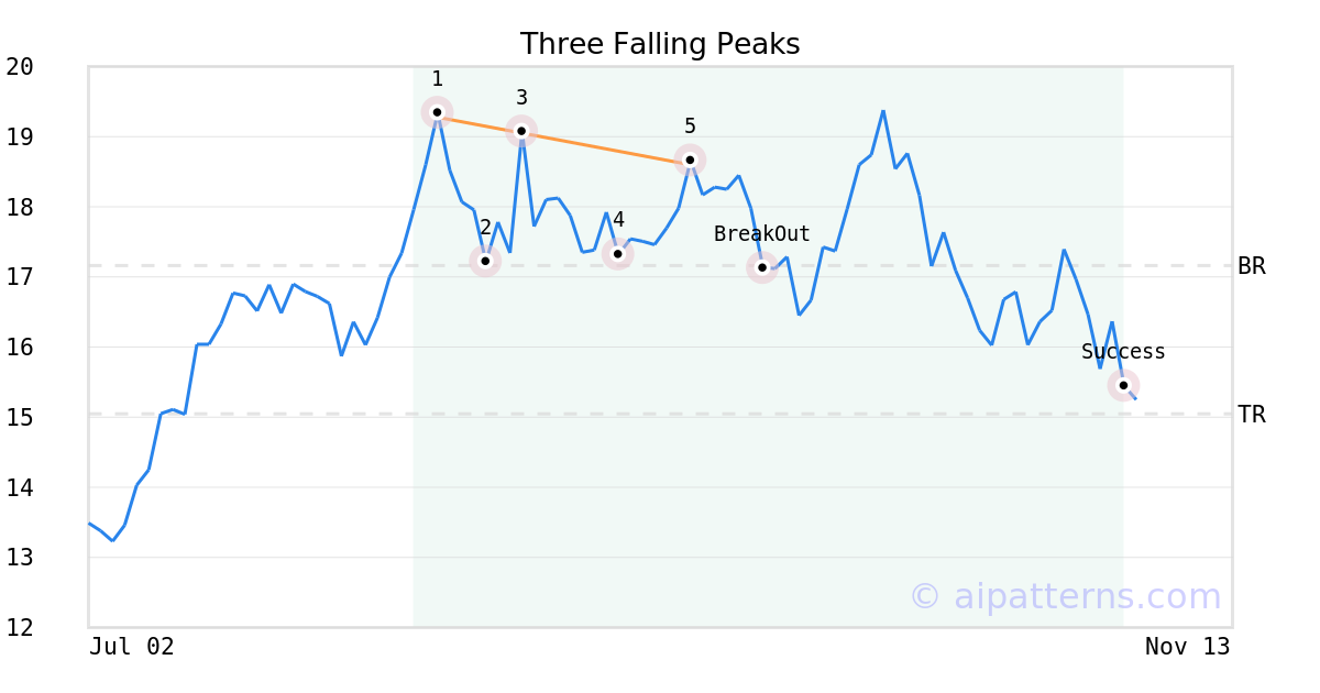 On September 12, 2025, A.I.dvisor detected a Three Falling Peaks Pattern (Bearish) for CoinShares Bitcoin & Ether ETF (BTF, $18.60). 10 days later, on September 22, 2025, A.I.dvisor confirmed the Bearish pattern, setting a target price of the stock. On November 03, 2025, the stock hit the target price of $15.05 – resulting in a +1 gain for traders who shorted the stock on the pattern detection date.