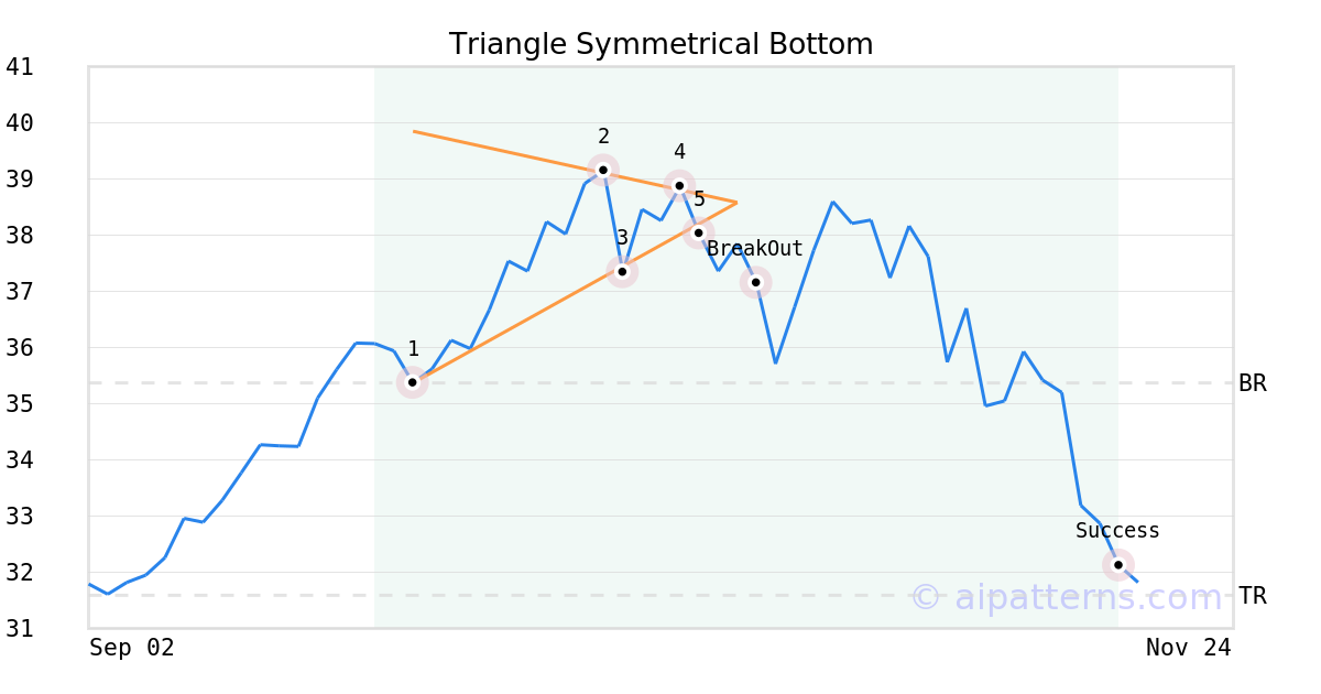 On October 16, 2025, A.I.dvisor detected a Triangle Symmetrical Bottom Pattern (Bearish) for VanEck Social Sentiment ETF (BUZZ, $38.03). 5 days later, on October 21, 2025, A.I.dvisor confirmed the Bearish pattern, setting a target price of the stock. On November 17, 2025, the stock hit the target price of $31.59 – resulting in a +1 gain for traders who shorted the stock on the pattern detection date.