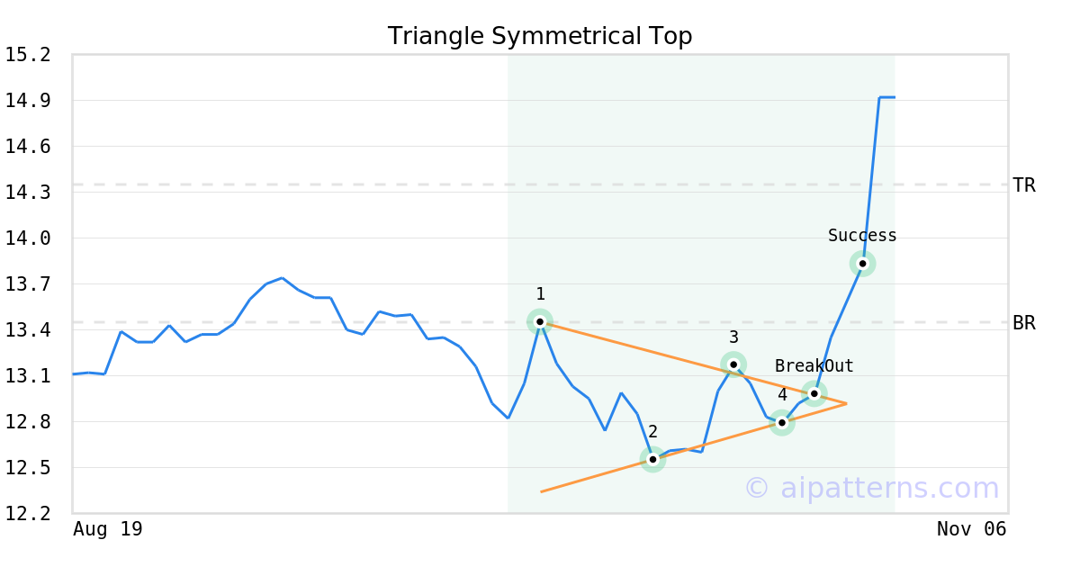 On October 23, 2025, A.I.dvisor detected a Triangle Symmetrical Top Pattern (Bullish) for Betterware de Mexico SAPI de CV (BWMX, $12.98). On October 23, 2025, A.I.dvisor confirmed the Bullish pattern, setting a target price of $14.35. 4 days later, on October 27, 2025, BWMX reached the target price resulting in a for traders who took a long position in the stock.