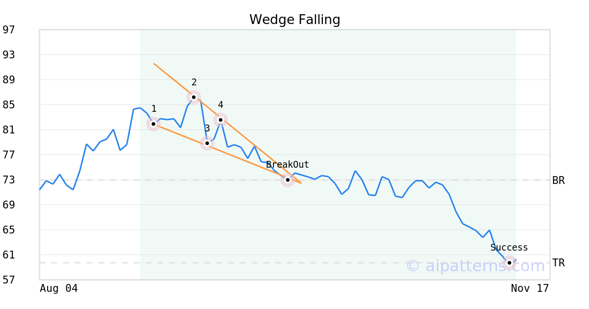 On September 25, 2025, A.I.dvisor detected a Wedge Falling Pattern (Bearish) for BlueLinx Holdings (BXC, $72.94). On September 25, 2025, A.I.dvisor confirmed the Bearish pattern, setting a target price of the stock. On November 10, 2025, the stock hit the target price of $59.72 – resulting in a +1 gain for traders who shorted the stock on the pattern detection date.