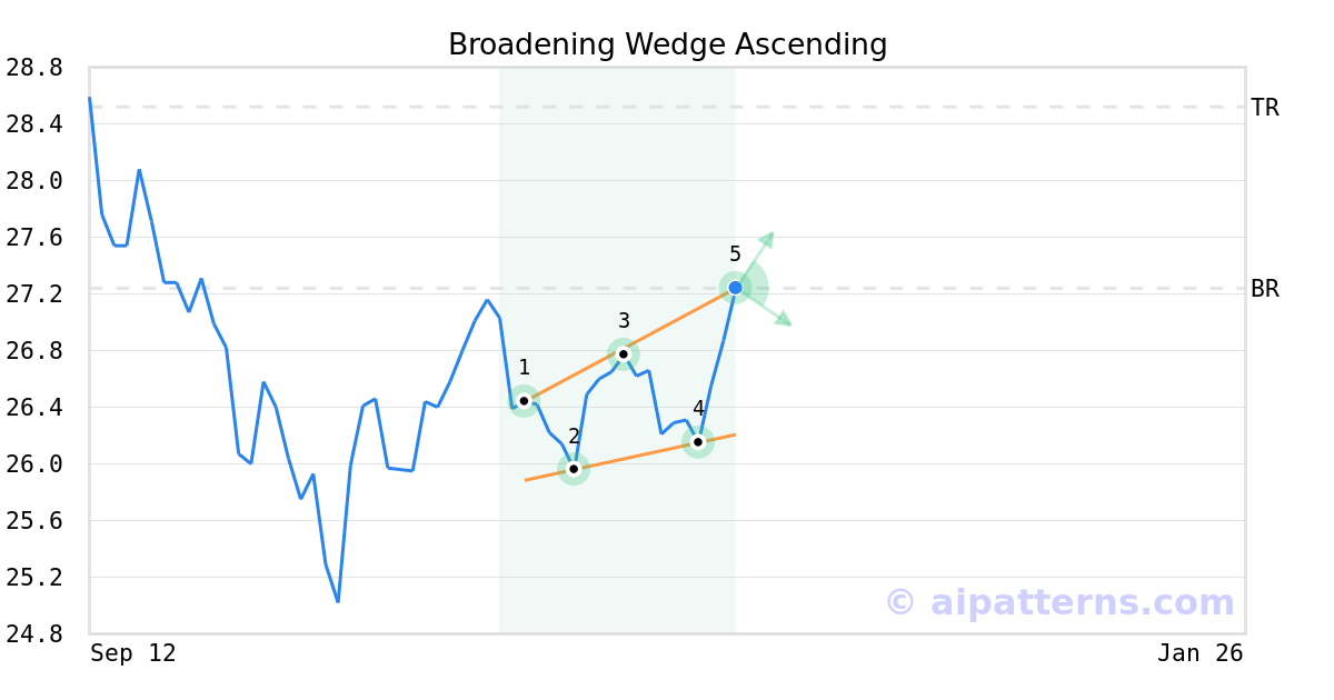 A.I.dvisor detected a bullish Broadening Wedge Ascending pattern for BXSL stock. This pattern was detected on November 25, 2025 . The odds of reaching the target price are 6.