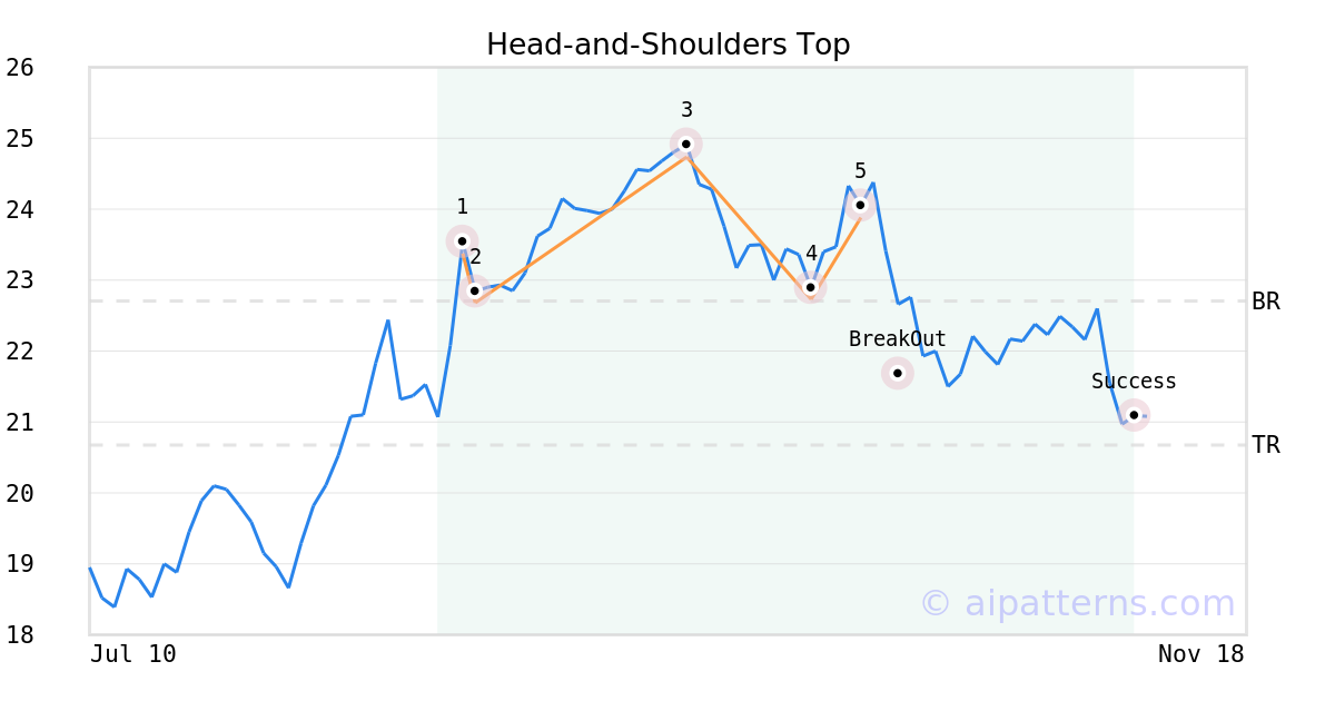On October 07, 2025, A.I.dvisor detected a Head-and-Shoulders Top Pattern (Bearish) for Kanzhun Limited (BZ, $23.88). 3 days later, on October 10, 2025, A.I.dvisor confirmed the Bearish pattern, setting a target price of the stock. On November 06, 2025, the stock hit the target price of $20.67 – resulting in a +1 gain for traders who shorted the stock on the pattern detection date.