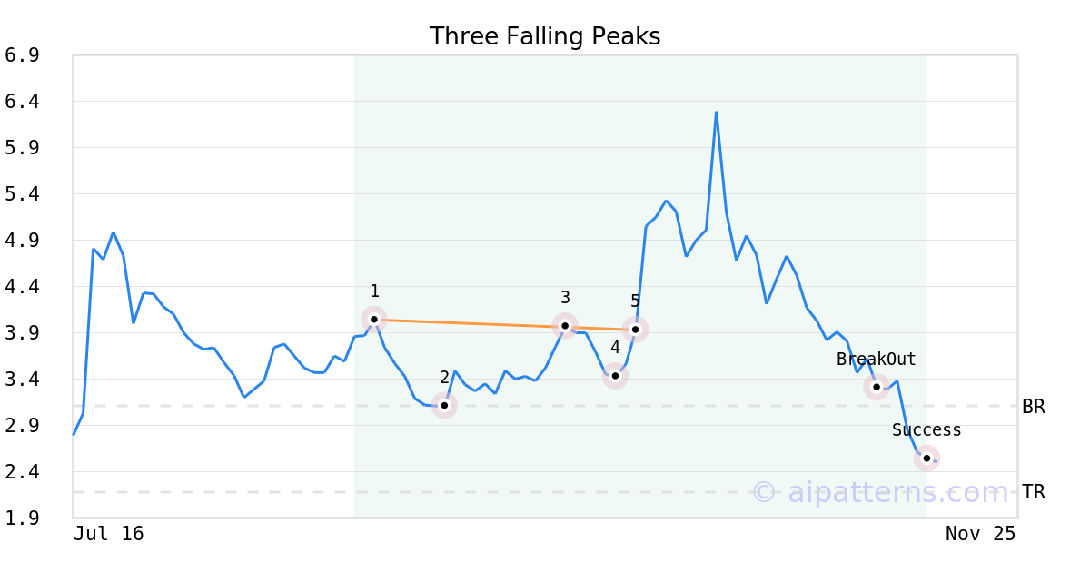 On October 03, 2025, A.I.dvisor detected a Three Falling Peaks Pattern (Bearish) for Blaize Holdings Inc (BZAI, $3.93). 34 days later, on November 06, 2025, A.I.dvisor confirmed the Bearish pattern, setting a target price of the stock. On November 13, 2025, the stock hit the target price of $2.18 – resulting in a +3 gain for traders who shorted the stock on the pattern detection date.