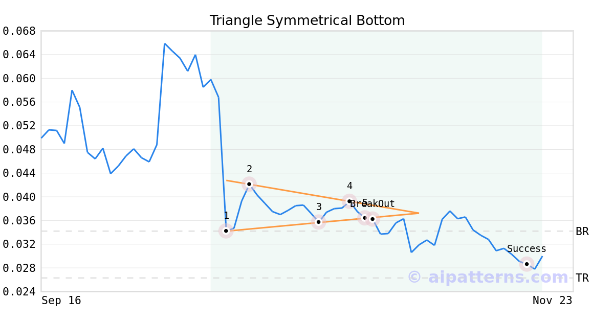 On October 28, 2025, A.I.dvisor detected a Triangle Symmetrical Bottom Pattern (Bearish) for Coin98 cryptocurrency (C98.X, $0.036396). 1 day later, on October 29, 2025, A.I.dvisor confirmed the Bearish pattern, setting a target price of the stock. On November 18, 2025, the stock hit the target price of $0.026300 – resulting in a +2 gain for traders who shorted the stock on the pattern detection date.