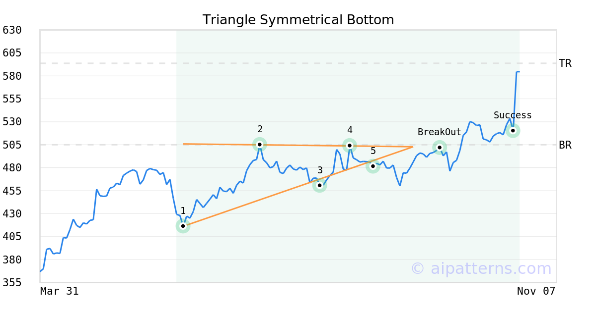 On August 22, 2025, A.I.dvisor detected a Triangle Symmetrical Bottom Pattern (Bullish) for Caci International CLA (CACI, $481.42). On September 22, 2025, A.I.dvisor confirmed the Bullish pattern, setting a target price of $593.74. 30 days later, on October 22, 2025, CACI reached the target price resulting in a for traders who took a long position in the stock.