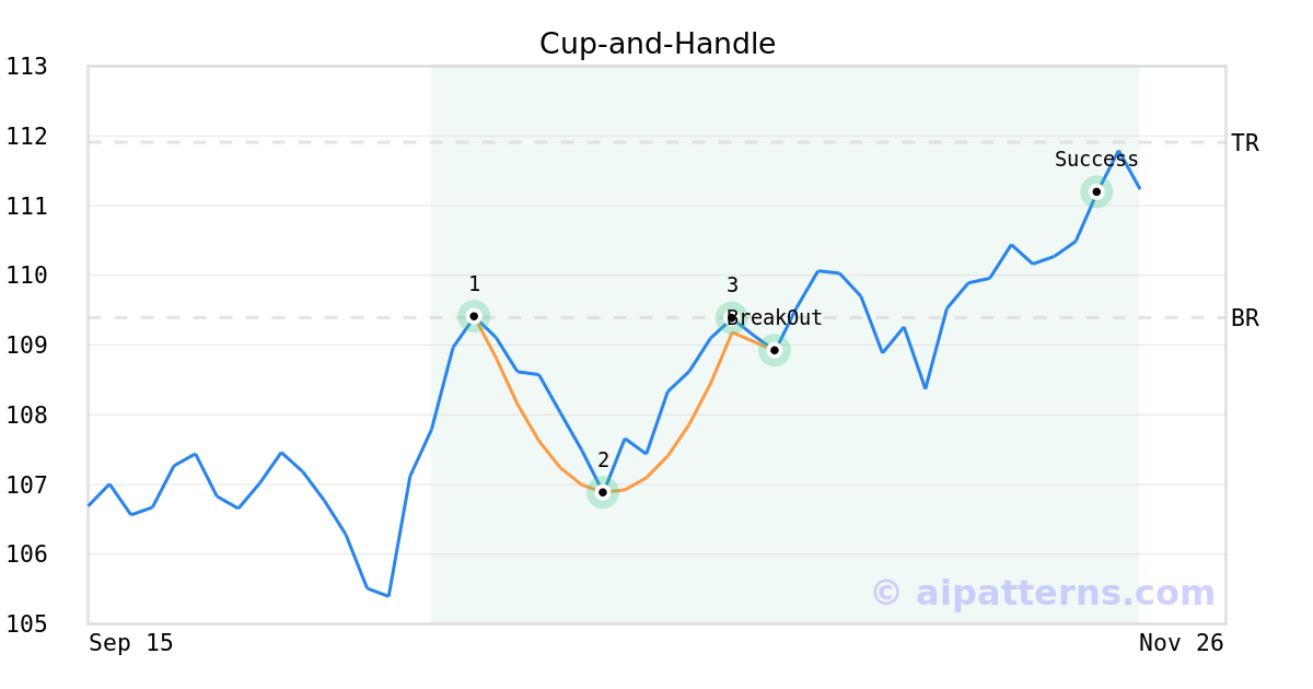 On October 29, 2025, A.I.dvisor detected a Cup-and-Handle Pattern (Bullish) for Canadian Dollar - Japan Yen (CADJPY, $109.536000). On October 29, 2025, A.I.dvisor confirmed the Bullish pattern, setting a target price of $111.908000. 21 days later, on November 19, 2025, CADJPY reached the target price resulting in a for traders who took a long position in the stock.