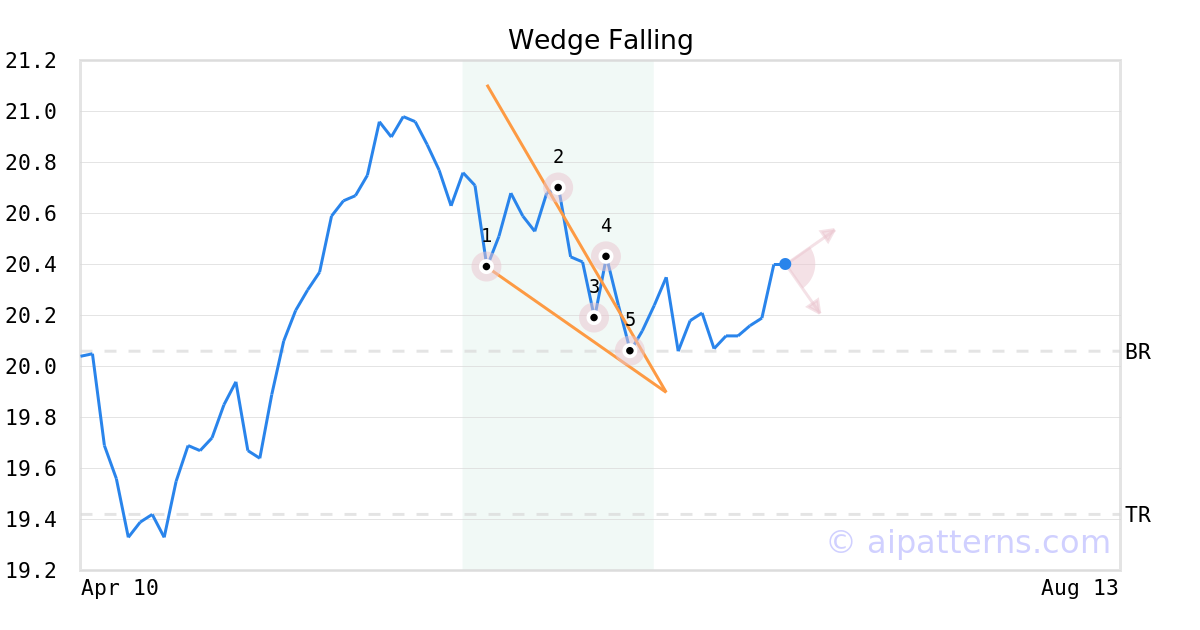 The Falling Wedge pattern forms when prices appear to spiral downward, with lower lows (1, 3, 5) and lower highs (2, 4) creating two down-sloping trend lines that intersect to form a triangle.