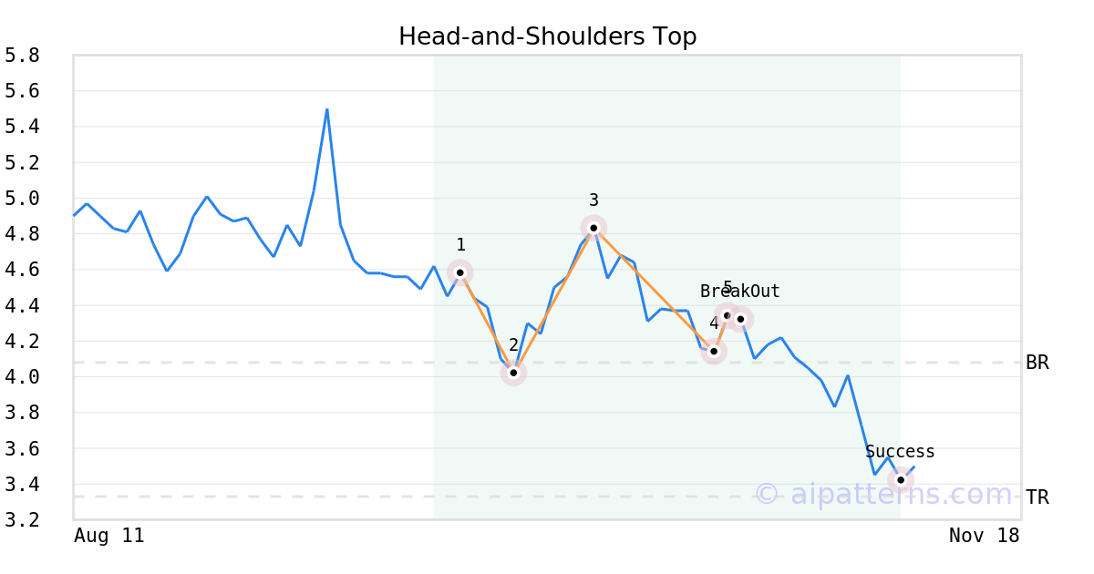 On October 20, 2025, A.I.dvisor detected a Head-and-Shoulders Top Pattern (Bearish) for Cango (CANG, $4.34). 1 day later, on October 21, 2025, A.I.dvisor confirmed the Bearish pattern, setting a target price of the stock. On November 06, 2025, the stock hit the target price of $3.33 – resulting in a +2 gain for traders who shorted the stock on the pattern detection date.