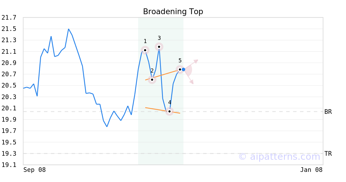 The Broadening Top pattern forms when a security price makes higher highs (1, 3, 5) and lower lows (2, 4) following two widening trend lines.