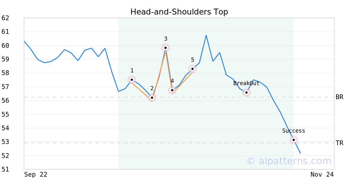 On October 27, 2025, A.I.dvisor detected a Head-and-Shoulders Top Pattern (Bearish) for Carrier Global Corp (CARR, $58.07). 10 days later, on November 06, 2025, A.I.dvisor confirmed the Bearish pattern, setting a target price of the stock. On November 17, 2025, the stock hit the target price of $52.92 – resulting in a gain for traders who shorted the stock on the pattern detection date.