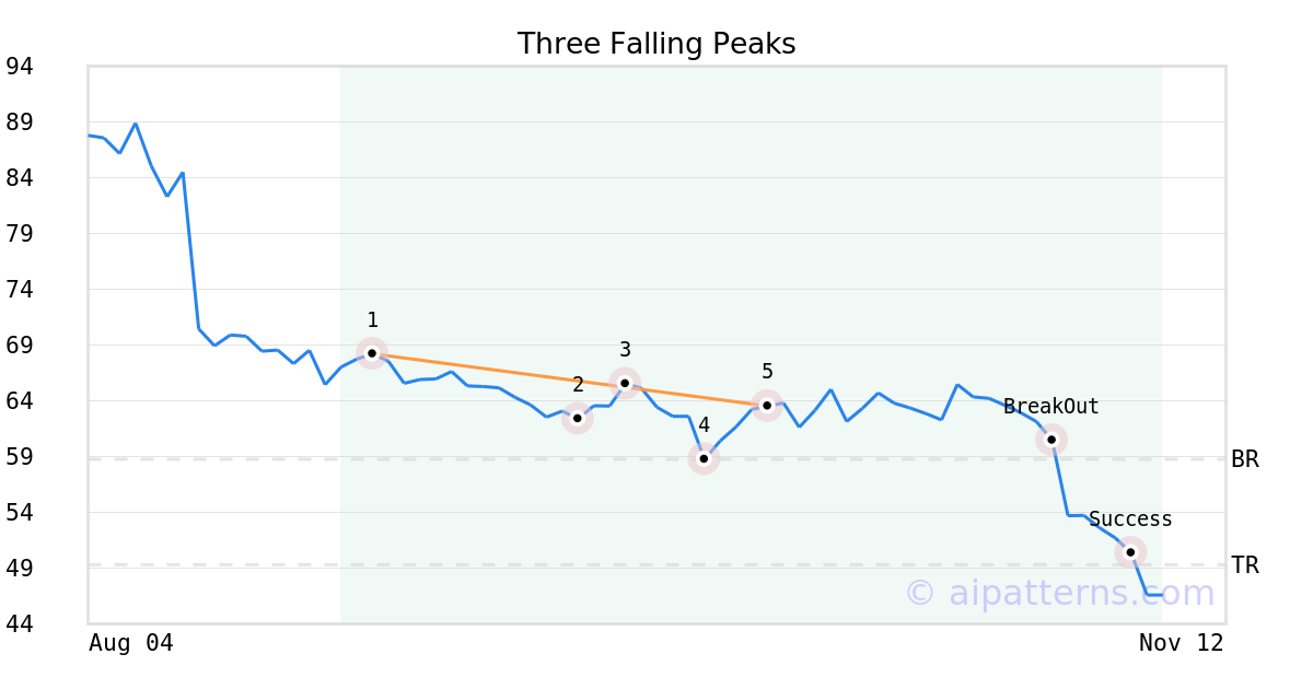 On October 03, 2025, A.I.dvisor detected a Three Falling Peaks Pattern (Bearish) for CAVA Group (CAVA, $63.24). 26 days later, on October 29, 2025, A.I.dvisor confirmed the Bearish pattern, setting a target price of the stock. On November 05, 2025, the stock hit the target price of $49.31 – resulting in a +2 gain for traders who shorted the stock on the pattern detection date.