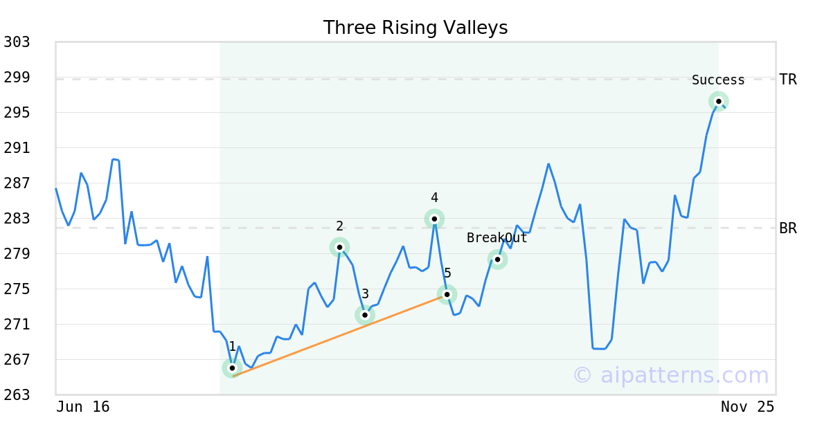 On September 15, 2025, A.I.dvisor detected a Three Rising Valleys Pattern (Bullish) for Chubb Limited (CB, $274.33). On September 25, 2025, A.I.dvisor confirmed the Bullish pattern, setting a target price of $298.76. 49 days later, on November 13, 2025, CB reached the target price resulting in a for traders who took a long position in the stock.