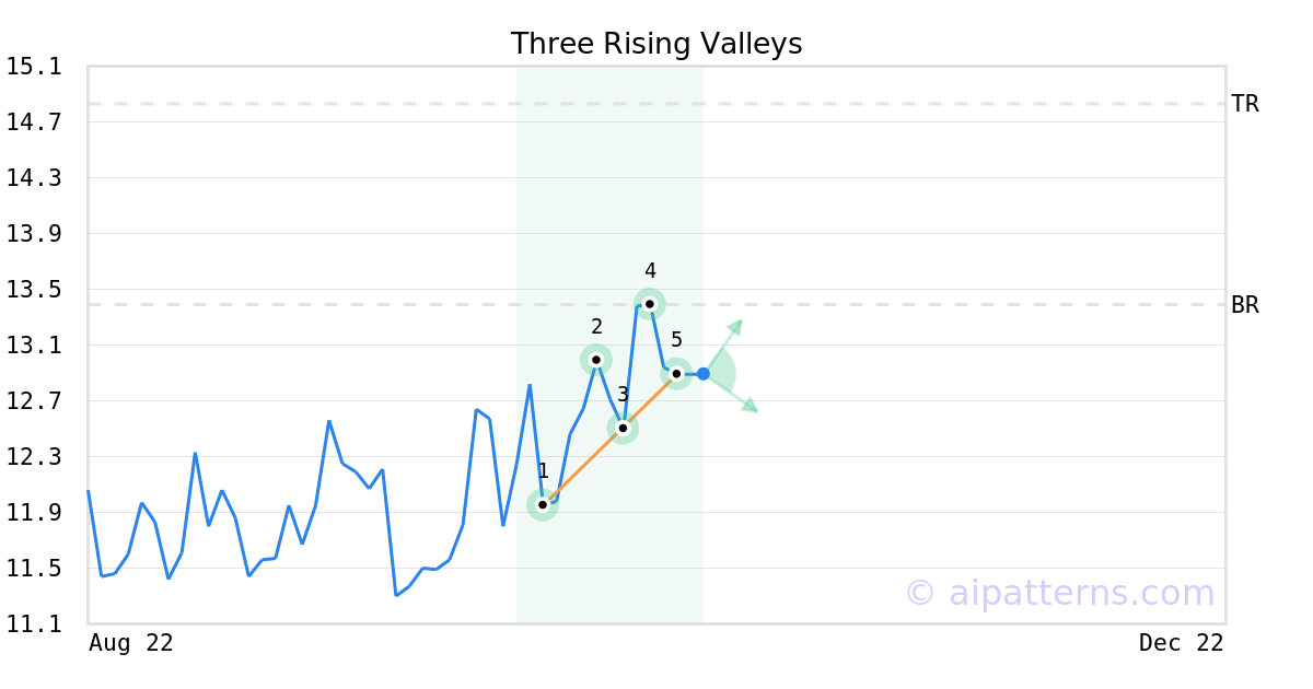 The Three Rising Valleys pattern forms when three minor Lows (1, 3, 5) are arranged along an upward sloping trend line.