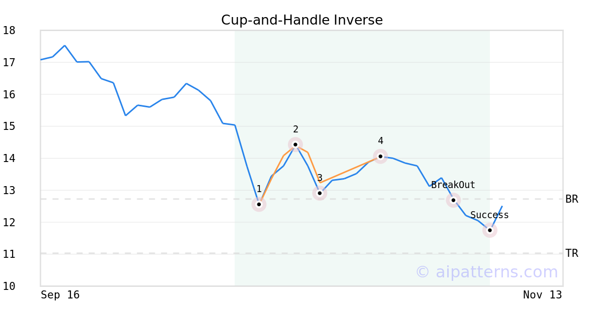 On October 24, 2025, A.I.dvisor detected a Cup-and-Handle Inverse Pattern (Bearish) for Chemours Company (The) (CC, $14.05). 10 days later, on November 03, 2025, A.I.dvisor confirmed the Bearish pattern, setting a target price of the stock. On November 06, 2025, the stock hit the target price of $11.03 – resulting in a +1 gain for traders who shorted the stock on the pattern detection date.