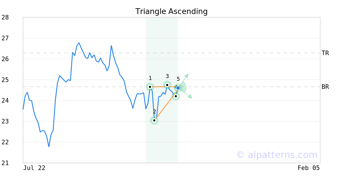 The Ascending Triangle pattern forms when the price of a security tests a resistance level and creates a horizontal top line (1, 3, 5), with an upward-sloping bottom line (2, 4) formed by a rising support level.