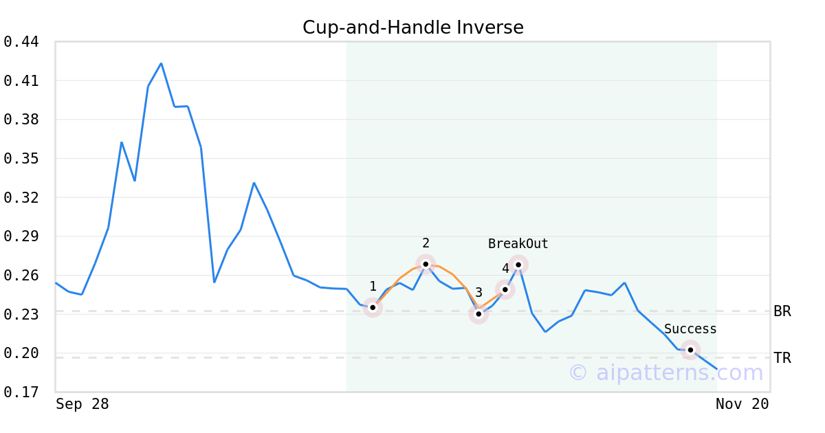 On November 01, 2025, A.I.dvisor detected a Cup-and-Handle Inverse Pattern (Bearish) for Celo cryptocurrency (CELO.X, $0.248518). 1 day later, on November 02, 2025, A.I.dvisor confirmed the Bearish pattern, setting a target price of the stock. On November 15, 2025, the stock hit the target price of $0.196500 – resulting in a +1 gain for traders who shorted the stock on the pattern detection date.