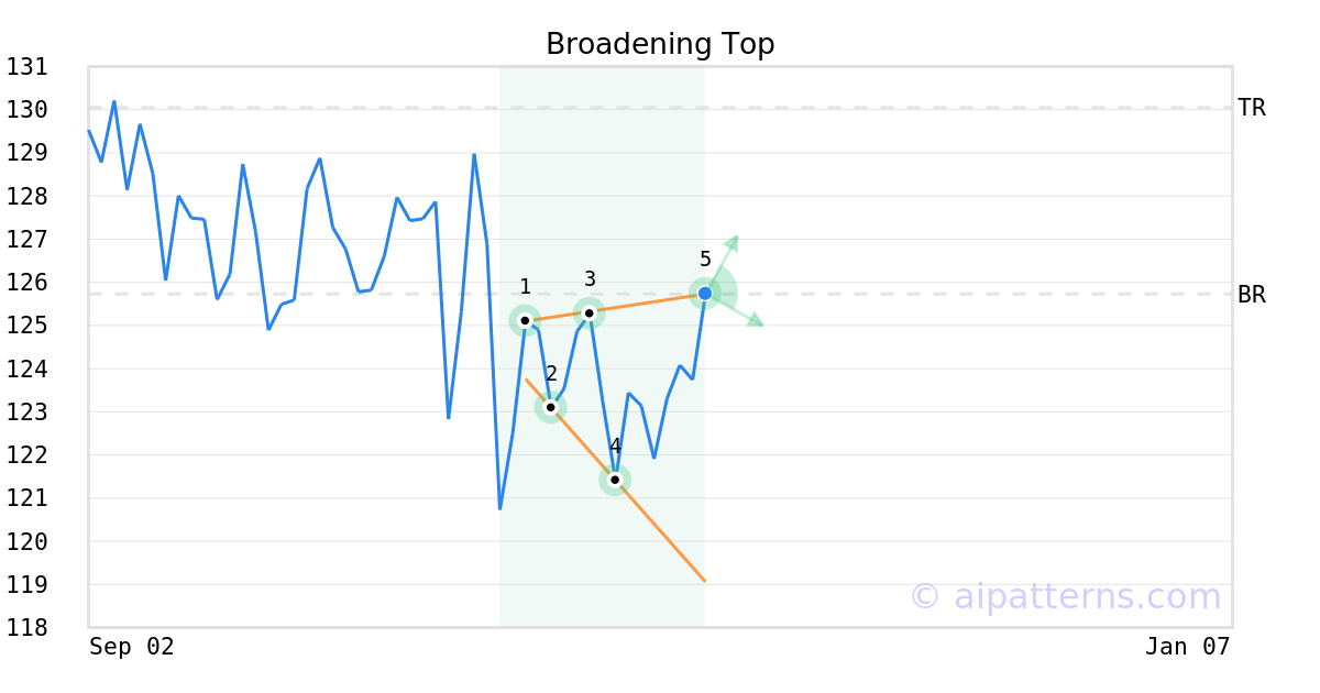 The Broadening Top pattern forms when the price of a security progressively makes higher highs (1, 3) and lower lows (2, 4) following two widening trend lines.