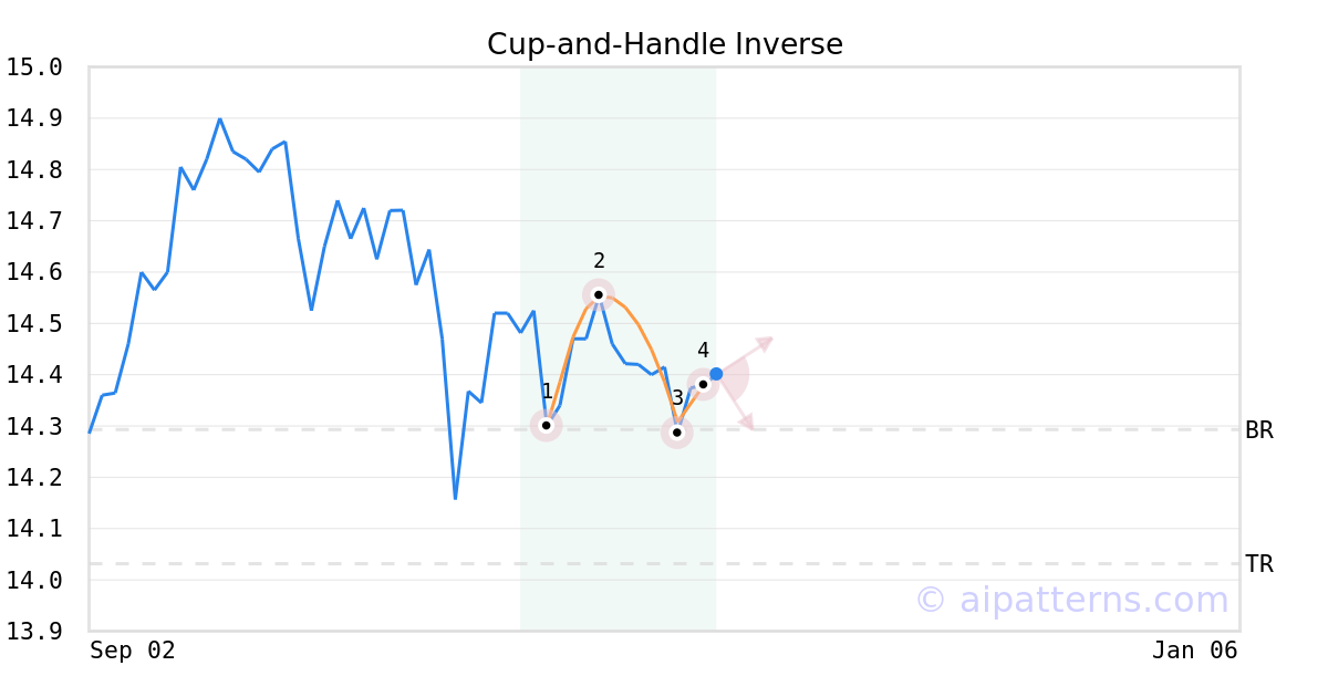 The Inverted Cup-and-Handle (sometimes called Inverted Cup-and-Holder) pattern forms when prices rise then decline to create an upside-down “U”like shape (1, 2, 3, also known as the Cup), followed by a shorter relatively straight price increase that bounces from the right lip (from 3 to 4, creating the Handle).